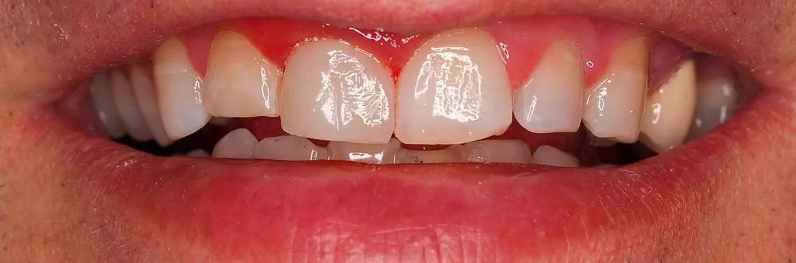 Zastosowanie materiału Activa Bioaktive Restorative w przypadku obciążonym rokowaniem, delikatnie mówiąc, niepewnym, z zastrzeżeniem warunkowego charakteru leczenia miało miejsce ponad dwa lata temu (marzec 2017 r.). Wspomniane ograniczenia w zakresie transparencji skłoniły do podjęcia dodatkowego licowania rekonstrukcji siekacza nr 11. Pacjent nie pojawił się na wizycie kontrolnej, lecz dopiero po upływie ponad 24 miesięcy, czyli w lipcu 2019 r. Powodem zgłoszenia się było uszkodzenie fragmentu materiału kompozytowego zastosowanego do licowania, odtworzonego z materiału Activa Bioactive Restorative i wzmocnionego wkładem z włókna szklanego rdzenia zrębu koronowego. Po kontroli radiologicznej wykonano naprawę uszkodzenia.