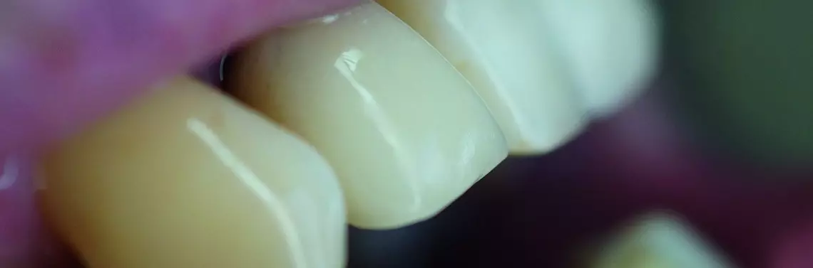 Analiza kliniczna i radiologiczna przeprowadzonego leczenia umożliwiła przystąpienie do odbudowy korony zęba z zastosowaniem porcelany skaleniowej Ceramco (Dentsply) łączonej adhezyjnie z tkankami zęba po uprzedniej addycyjnej odbudowie zrębu korony. Zweryfikowano kolor ceramiki, potwierdzając wybrany wcześniej kolor. Założono koferdam i usunięto wypełnienie tymczasowe.