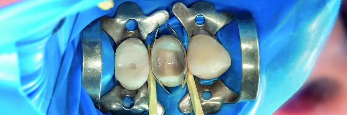 Podczas preparacji ubytków próchnicowych stwierdzono, że dno ubytku w zębie 14. w części dystalnej było położone w obrębie zębiny wtórnej. W zębach 13. i 15. dno znajdowało się w obrębie środkowych warstw zębiny, w dostatecznej odległości od miazgi zębów. Nie było żadnych klinicznych oznak połączenia pomiędzy ubytkiem a komorą miazgi. W obrębie dna ubytku pozostawiono in situ niewielką ilość zbitej zębiny, przebarwionej z powodu pigmentów (zdj. 2).