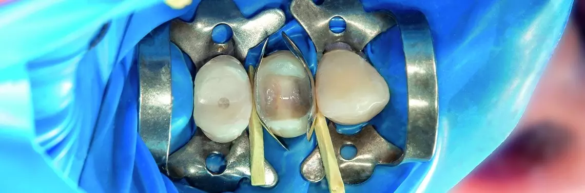Przed ostateczną preparacją założono koferdam, który ustabilizowano drewnianymi klinami wprowadzonymi do przestrzeni międzyzębowych.