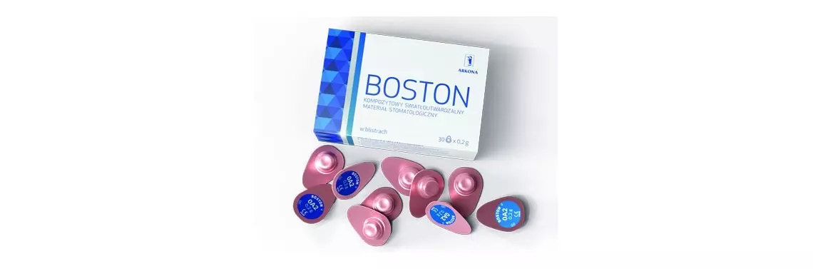 Doświadczenia wyniesione z opinii użytkowników NEXT’a skłoniły producenta materiału Boston do wprowadzenia identycznego rozwiązania. Już lada moment na rynek trafi materiał Boston, ten który poddany był delikatnym adaptacjom w roku 2018. Przyjazna plastyczność, wysoka wytrzymałość. Dostępna gama kolorów obejmująca dwa kolory opakerowe OA2 oraz OA3, rozszerzona o uniwersalny poziom transparencji kolory: A1, A2, A3, A3,5, B1, B2, C2, D2, D3. Dopełnieniem jest masa − tworzywo transparentne. Wspomniana modyfikacja zmieniła lepkość materiału, co przekłada się na łatwość modelowania i homogenność wypełnień, minimalizując również ryzyko zamykania pęcherzyków powietrza. Po polimeryzacji materiał łatwo poddaje się polerowaniu, uzyskując trwały połysk, co oprócz walorów estetycznych przekłada się również na trwałość wypełnień. Wprowadzony materiał dostępny będzie w pełnej gamie kolorów i jednej wielkości blistrów, zawierających 0,2 g kompozytu. Zatem, stawiając na bezpieczeństwo i łatwość pracy mamy do dyspozycji już dwa materiały dostępne w jednorazowych blistrach: Boston w porcjach 0,2 g oraz Next dostępny zarówno w porcjach 0,07, jak i 0,2 g. Warto wspomnieć, że opisywana forma konfekcjonowania zmniejsza również ryzyko przypadkowego naświetlenia materiału w niezamkniętej strzykawce, a to jeden z najczęstszych obserwowanych błędów.