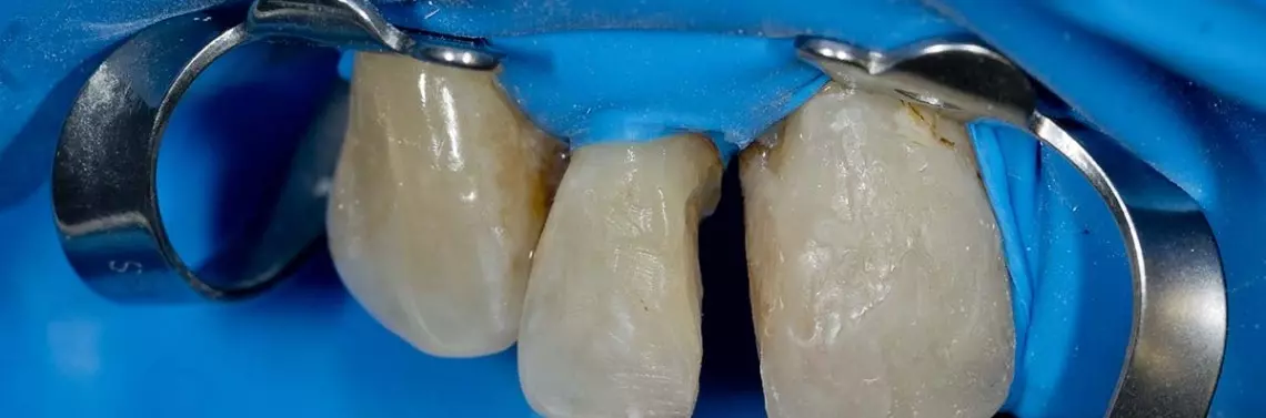 Pacjentka zgłosiła się w celu wymiany nieszczelnych wypełnień i poprawy estetyki uśmiechu w odcinku przednim. Zdecydowano rozpocząć leczenie od wymiany nieszczelnego wypełnienia klasy IV w zębie 12. Założono koferdam i usunięto nieszczelne wypełnienie. Aby idealnie odtworzyć brakujący fragment zęba zastosowano Fusion Anterior matrix System firmy Garrison w postaci profilowanego metalowego paska i dostosowanego klina. Kształtka umożliwiła modelowanie powierzchni stycznej wypełnienia. Następnie wytrawiono powierzchnię szkliwa i zastosowano uniwersalny samotrawiący system łączący OPTIbond XTR Universal. Wypełnienie wykonano z materiału OPTIshade o odcieniu M, który dostosowuje się do koloru zęba. Planowane jest dalsze leczenie w postaci wymiany pozostałych nieszczelnych wypełnień.