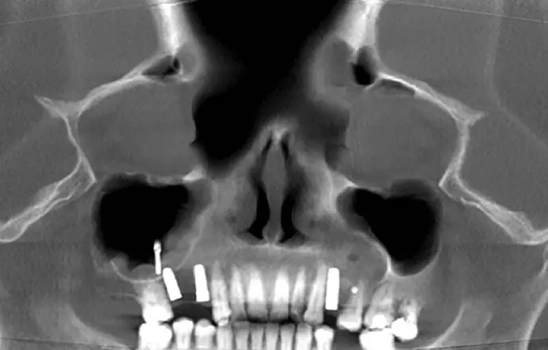 Dno zatoki szczękowej powinno być oddzielone od korzeni zębów kilkunastomilimetrową warstwą kości. Nie można dopuścić, aby końcówki implantów dochodziły aż do zatoki.