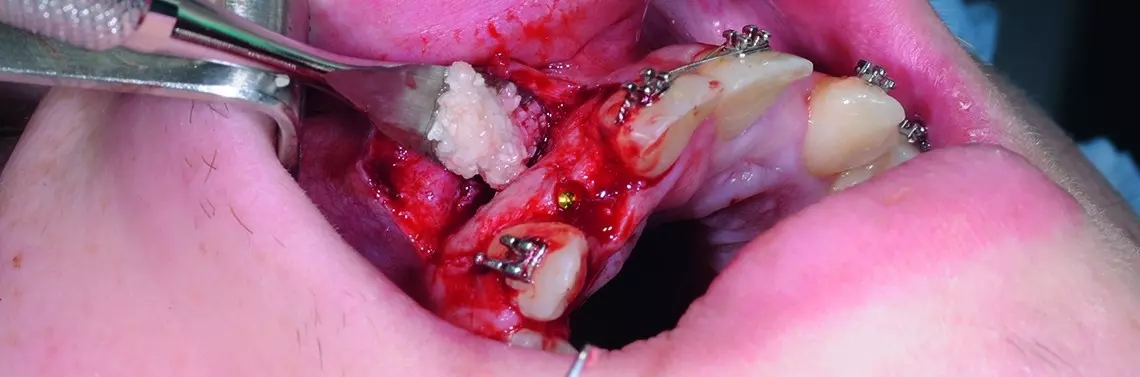 Autogenny materiał kostny pochodzenia zębowego umieszczono w ubytku tak, aby pokrył odsłoniętą powierzchnię implantu. Materiał po nasączeniu krwią był dostatecznie zwięzły i nie wymagał zastosowania dodatkowych membran. Po uwolnieniu okostnej pole operacyjne zostało zamknięte bez napięcia, umożliwiając gojenie podśluzówkowe implantu. Wargowy zarys wyrostka był bardziej wypukły niż przed augmentacją. Zaplanowano odsłonięcie implantów za 3 miesiące.