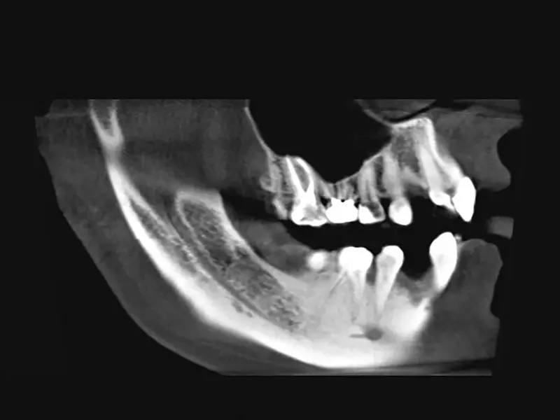 Pacjent, lat 19, leczony ortodontycznie. Ze względu na brak zawiązków zębów 12. i 22. zaplanowano leczenie implantologiczne. Biorąc pod uwagę ukształtowanie wyrostka zębodołowego w tych okolicach oraz możliwość powstania fenestracji wierzchołkowej w czasie wprowadzania implantów, przewidywano konieczność zastosowania materiału kostnego. Pacjent „dysponował” własnym materiałem kostnym w postaci dwóch zatrzymanych trzecich zębów trzonowych. Uznano, że ilość materiału pochodząca z jednego trzonowca będzie wystarczająca do zaopatrzenia obu miejsc implantacji.