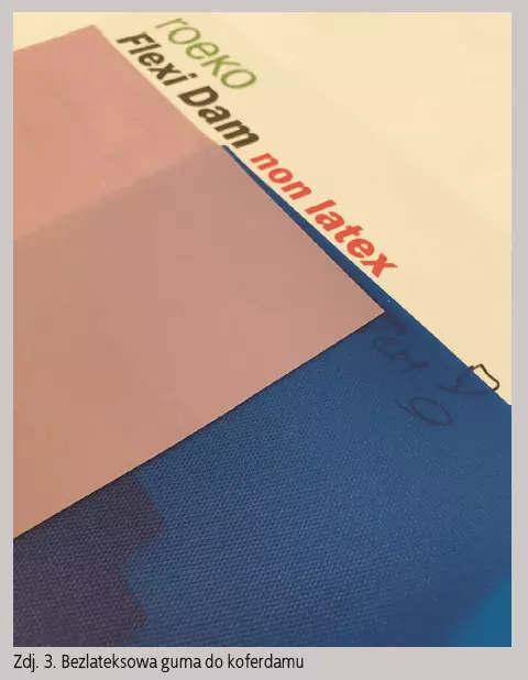 Kiedy już uporamy się z założeniem gumy na ramkę – „uporamy” to słowo dobrze odzwierciedlające początkowe kłopoty z jej poprawnym założeniem – przechodzimy do kolejnego etapu, czyli założenia koferdamu na ząb. Zakładanie koferdamu razem z ramką jest dużo wygodniejsze i dla lekarza, i dla pacjenta, a także dużo bardziej ergonomiczne niż zakładanie gumy na ząb, a następnie ramki na gumę.
