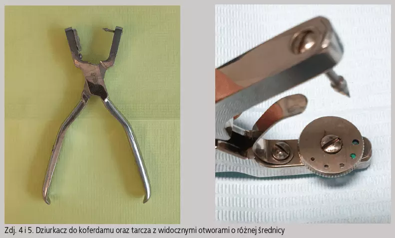 Kolejnym elementem jest dziurkacz do koferdamu. Posiada on tarcze z otworami w liczbie od pięciu do siedmiu, różniącymi się między sobą średnicą. Rozmiar otworu dobierany jest w zależności od wielkości zęba w okolicy szyjki. Najmniejsze otwory używane są podczas leczenia siekaczy, średnie rozmiary to zwykle zęby przedtrzonowe i kły szczęki, najszersze są zarezerwowane dla zębów trzonowych.