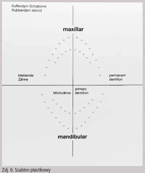 W przypadku dziurkacza posiadającego pięć rozmiarów otworów polecam Państwu następujący system, który sprawdzi się w większości przypadków. Najmniejszy otwór wykonujemy dla siekaczy żuchwy, kolejny to siekacze boczne szczęki i kły żuchwy, środkowy rozmiar to zęby przedtrzonowe żuchwy, przedostatni to zęby przedtrzonowe szczęki, a ostatni, największy, zarezerwowany jest dla zębów trzonowych. Od tych zasad oczywiście są odstępstwa i należy modyfikować rozmiar otworu w zależności od okoliczności klinicznych. Jeśli leczenie ma się odbywać przez koronę protetyczną, można zwiększyć otwór w gumie o jeden rozmiar. Jeśli ząb jest bardzo zniszczony poddziąsłowo, rozmiar otworu możemy zmniejszyć o jeden.