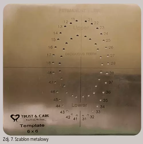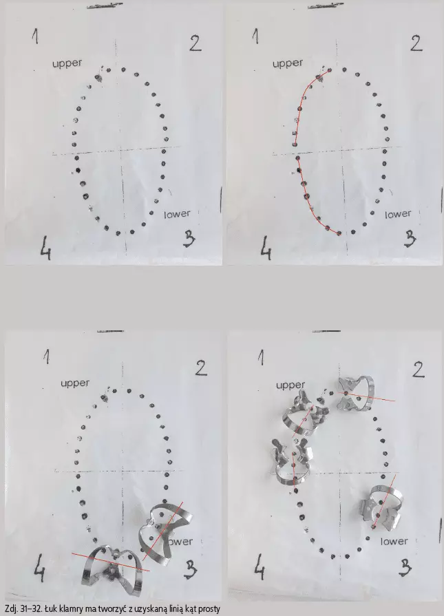 Skoro wiemy, jakich klamer używać w jakich sytuacjach, przejdźmy do kolejnego etapu, jakim jest przygotowanie koferdamu do założenia. W tym celu na podstawie szablonu należy wyciąć otwór na ząb. Ważną rzeczą jest orientacja klamry w stosunku do osi łuku zębowego. Szablon najlepiej ułożyć tak, jak jest ułożony pacjent na fotelu, czyli górnym łukiem w naszą stronę. Jeśli połączymy ciągłą linią „kropki”, uzyskamy linię odniesienia do położenia klamer. Łuk klamry ma zawsze tworzyć z tak uzyskaną linią kąt prosty (zdj. 31–32).