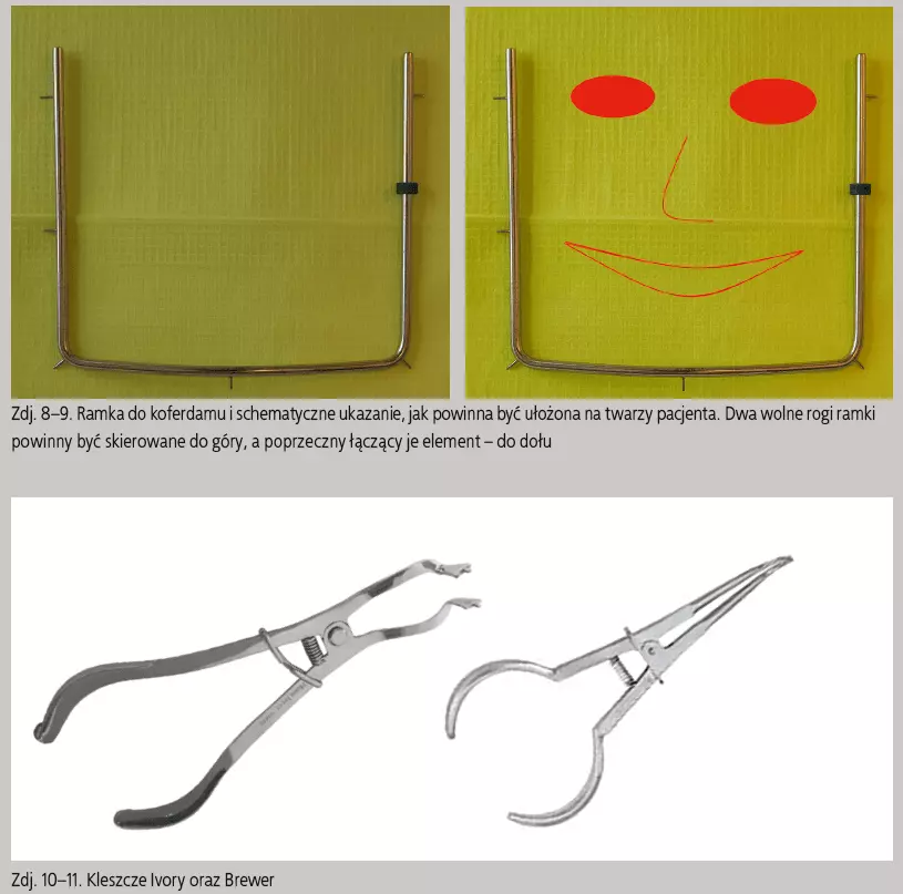 Skoro wiem już, jak przygotować na ramce gumę do koferdamu z wyciętym otworem, przejdziemy do omówienia zamocowania jej na zębie. Do tego niezbędne są kleszcze do koferdamu oraz klamry.