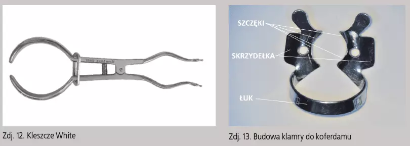 Ostatnim elementem układanki są klamry do koferdamu. Służą one do osadzenia gumy rozpiętej na ramce na zębie. Każda klamra składa się ze szczęk i łuku. Klamra może posiadać skrzydełka lub nie, część klamer ma podwójny łuk. Klamry różnią się kształtem i mają oznaczenia cyfrowo-literowe. Dobiera się je do zęba, biorąc pod uwagę jego szerokość w okolicy szyjki. Standardową budowę klamry przedstawiono na zdjęciu 13. Otwory w klamrze służą do osadzania kleszczy do koferdamu.
