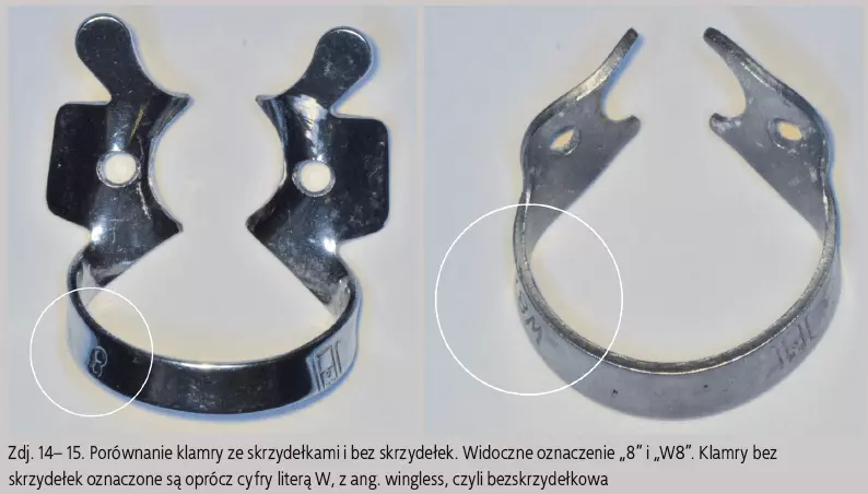 - Klamry nr W8 i nr W14 (zdj. 29–30) to klamry bezskrzydełkowe używane do leczenia zębów trzonowych szczęki i żuchwy. Są przeznaczone do metody „najpierw klamra, potem guma”.