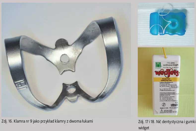 Do szczelnego założenia gumy na ząb lub grupę zębów niezbędna jest jeszcze nić dentystyczna. Czasami dodatkowo stosuje się gumki widget do stabilizacji gumy koferdamu.
