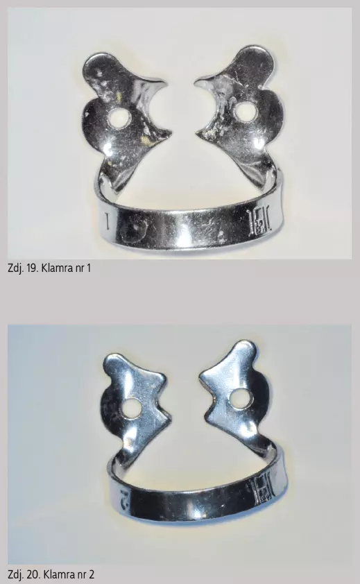 - Klamra nr 1 (zdj. 19) jest używana do górnych kłów i zębów przedtrzonowych szczęki, a także do zniszczonych do- lub poddziąsłowo zębów trzonowych żuchwy. Można jej użyć do siekaczy centralnych szczęki, ale należy delikatnie operować klamrą od przedsionka, gdyż założona zbyt mocno poddziąsłowo może powodować recesję.