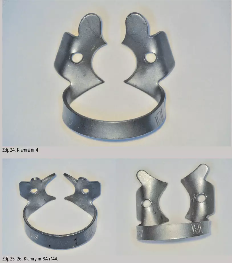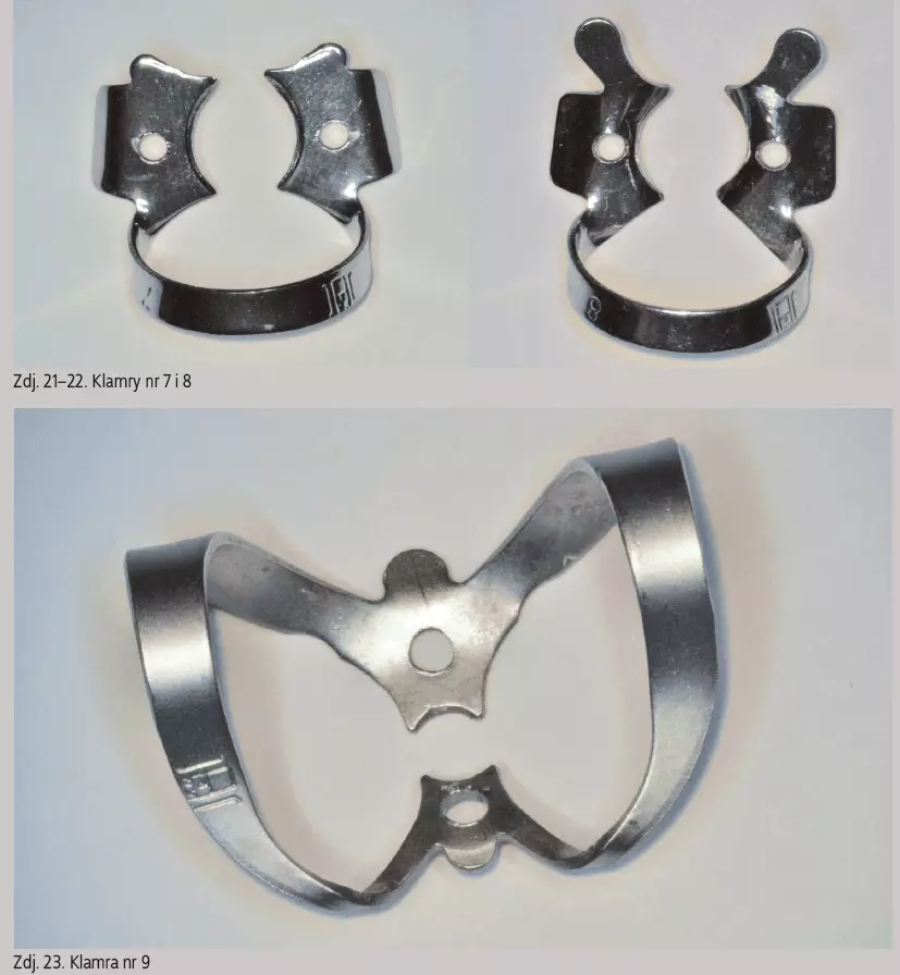 - Klamry nr 7 i nr 8 (zdj. 21–22) do zębów trzonowych szczęki i żuchwy. Klamra nr 8 pozycjonuje się głębiej poddziąsłowo, więc jest przydatna do leczenia zębów złamanych, zębów, które były szlifowane pod korony, lub rewidowanych po usunięciu wkładów lanych.