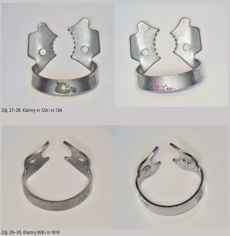- Klamry nr 12A i nr 13A (zdj. 27–28) są klamrami anatomicznymi przeznaczonymi do wykorzystania podczas leczenia kanałowego zębów trzonowych szczęki. Jak widać na zdjęciu, szczęki klamry różnią się rozmiarem. Węższa szczęka leży od strony korzenia podniebiennego, a szersza od strony policzkowej. Zwiększona liczba ząbków w szczękach pozwala stabilnie osadzić klamrę nawet przy bardzo nieregularnym i zniszczonym zrębie. Klamry te mają jednak wadę – są dość wąskie jak na przeznaczone do zębów trzonowych, więc w przypadku użycia ich na zębie zbyt szerokim w okolicy szyjki będą miały tendencję do pękania.