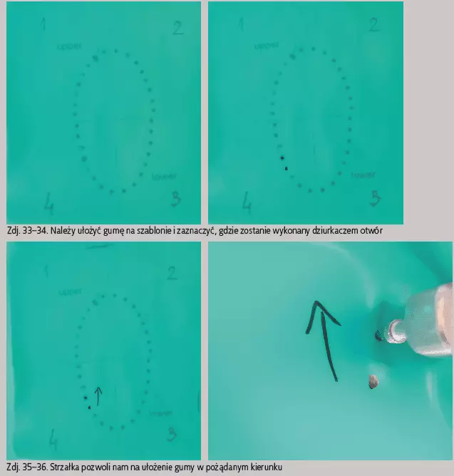 Kiedy już wiemy, jak powinna być zorientowana klamra względem gumy, przejdźmy do założenia gumy na ramkę. Na początek należy położyć gumę na szablonie i zaznaczyć miejsca, w których wykonamy dziurkaczem otwór (zdj. 33–34). Dobrze jest także zaznaczyć strzałką lub innym symbolem kierunek górnego łuku. Jest to szczególnie przydatne, jeśli stracimy na chwilę orientację i okaże się, że guma nie leży już tak, jak my chcemy, tylko tak, jak chciała grawitacja. Strzałka pozwoli nam na ułożenie gumy w pożądanym kierunku (zdj. 35–36).