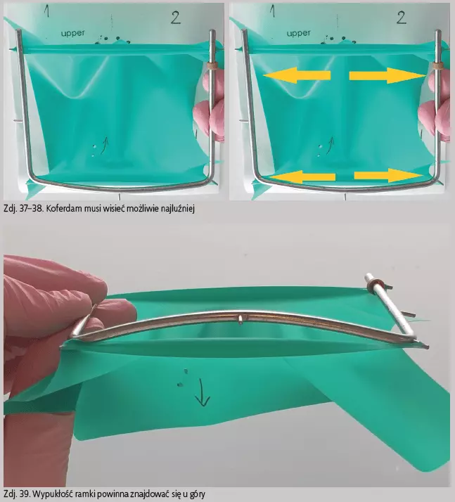 Kolejnym krokiem jest założenie gumy od koferdamu na ramkę. Bardzo istotne jest, aby koferdam wisiał możliwie najluźniej. Jeśli rozciągniemy koferdam zbyt mocno i będzie on tworzył płaską powierzchnię, wtedy z dużym prawdopodobieństwem klamra spadnie lub guma ulegnie rozdarciu (zdj. 37–38).