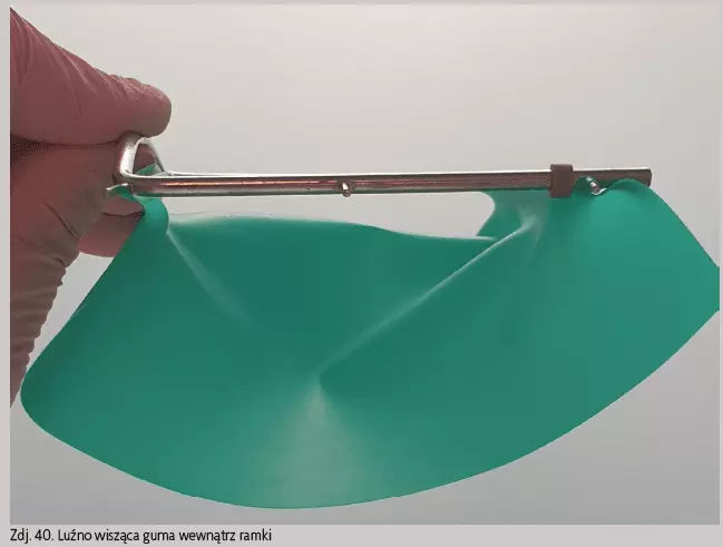Widok z boku (zdj. 40) ukazuje luźno wiszącą gumę wewnątrz ramki. W swojej codziennej praktyce zakładam gumę tak, że poza skrajnymi górnymi i dolnymi kolcami mam 2–3 mm wolnej gumy. Gwarantuję Państwu, że tak założona na ramkę guma nie będzie ściągać z zęba dobrze dobranej klamry, a także nie będzie pękać po założeniu.
