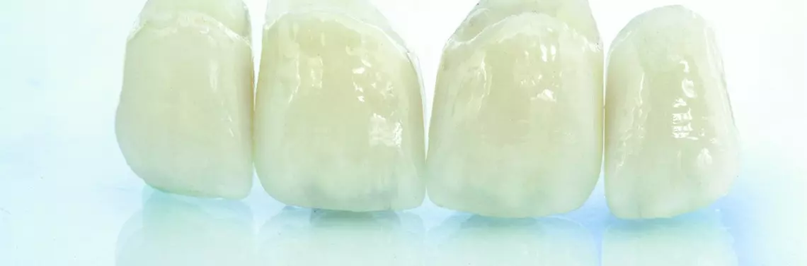 Pacjentka zakwalifikowana do leczenia kompleksowego obejmującego ponowne leczenie endodontyczne oraz wymianę użytkowanych od blisko 10 lat i częściowo uszkodzonych stałych uzupełnień protetycznych zgłosiła się z prośbą o naprawienie uszkodzonego wypełnienia i w miarę możliwości korektę estetyki w odcinku przednim (zdj. 8). Po zapoznaniu się z planem leczenia zasugerowano wykonanie licówek częściowych na siekaczach centralnych zapewniających korektę kształtu. Skrupulatny plan leczenia miał charakter długofalowy, a zaplanowane leczenie zachowawcze nie zaburzało go w żadnym zakresie. Po oczyszczeniu powierzchni zębów i usunięciu części materiału kompozytowego wypełnienia w zębie 11 wytrawiono jego powierzchnię (zdj. 9). Po aplikacji i polimeryzacji systemu łączącego naniesiono warstwę materiału kompozytowego i wymodelowano go przy użyciu pędzelka. Po odtworzeniu zarysu koron domykającego delikatnie przestrzeń i polimeryzacji materiału dokonano opracowania tej warstwy przy użyciu krążków, co w prosty sposób pozwoliło uzyskać zrównanie powierzchni obu zębów i linii brzegów siecznych. Do wymodelowania materiału w rejonie przydziąsłowym wykorzystano paski celuloidowe wsunięte pod nitki retrakcyjne zgodnie z zaleceniami pomysłodawcy – B. Hugo (zdj. 10). Powierzchnię osuszono i ponownie przeprowadzono etapy aplikacji bondu.