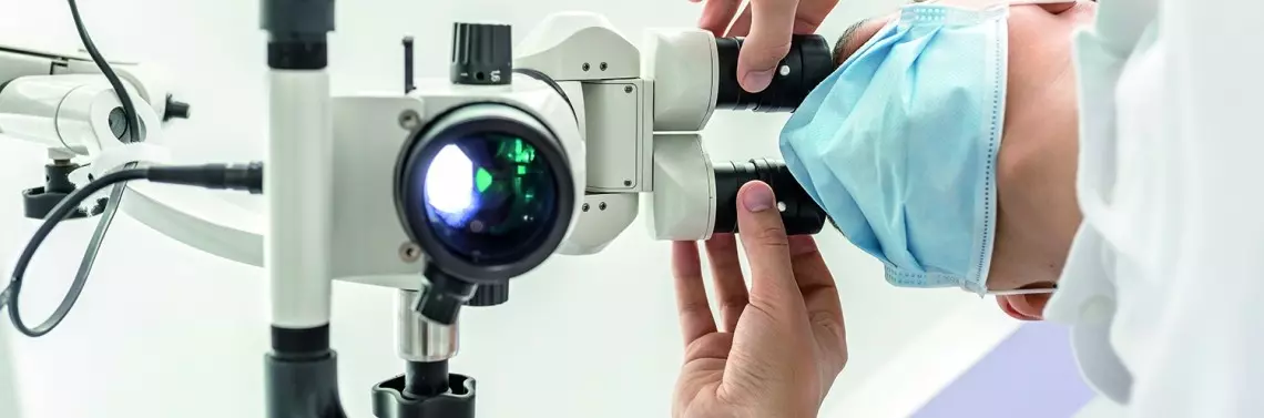 Najpierw lekarz powinien usiąść wygodnie, ustawić mikroskop do swoich indywidualnych potrzeb. Następnie ustawia on pacjenta do mikroskopu i do swojej już ustalonej pozycji. W trakcie zabiegu mikroskop (przy prawidłowym ustawieniu widzenia stereoskopowego i współogniskowego) zazwyczaj pozostaje w tej samej pozycji i nie ma potrzeby wykonywania nim żadnych ruchów. Widzenie stereoskopowe to możliwość widzenia w polu operacyjnym równocześnie obojgiem oczu wyraźnego, nierozmytego, pojedynczego obrazu. Widzenie to reguluje się pokrętłem rozstawu źrenic indywidualnie do potrzeb danego operatora. Ustawienie widzenia współogniskowego umożliwia wyraźne widzenie pola operacyjnego na każdym używanym przez lekarza powiększeniu. Aby ustawić to widzenie, należy uchwycić ostrość wybranego szczegółu na najwyższym powiększeniu na pokrętle danego mikroskopu. Dioptrie w kauszach powinny być ustawione na pozycję 0. Następnie należy ustawić powiększenie mikroskopu na najmniejsze i indywidualnie dla każdego oka ustawić liczbę dioptrii pokrętłem na kauszach, aby obraz w obserwowanego był wyraźny. Po takim ustawieniu obraz powinien być wyraźny po każdej zmianie powiększenia bez konieczności zmiany położenia pacjenta (przybliżenia bądź oddalenia) (źródło. www.seliga.pl).