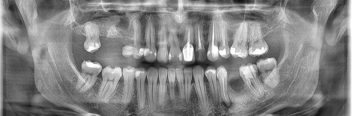 71-letnia pacjentka została przyjęta w gabinecie. Uskarżała się na obrzęk dziąseł w pobliżu mostu, który był sporadycznie bolesny. Zgłosiła również łagodny dyskomfort podczas żucia. Pacjentka miała most, który istniał od 20 lat. Wstępne badanie wykazało pionowy ubytek kostny wzdłuż mezjalnej powierzchni korzenia na poziomie grzebienia kostnego i widoczną dużą zmianę okołowierzchołkową w kształcie litery J na dystalnej powierzchni korzenia drugiego przedtrzonowca żuchwy po lewej str...