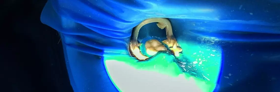 Postanowiono wykonać leczenie interdyscyplinarne, które rozpoczęło się usunięciem starych wypełnień z obszaru korony, odbudową zęba do I klasy oraz usunięciem w powiększeniu wkładu z kanału perforacji. Po tych krokach usunięto tkanki zdemineralizowane z obrębu perforacji wraz z odessaniem zawartości w postaci wysięku ropnego – przeprowadzono płukanie H2O2 oraz solą fizjologiczną, a ubytek tymczasowo zaopatrzono. Podczas kolejnej wizyty po 7 dniach otrzymano informację o mniejszej symptomatyczności zęba. Po usunięciu materiału tymczasowego ubytek w części koronowej oraz zmiana były wypełnione opalizującym płynem, co poniekąd potwierdzało wcześniejsze przypuszczenia co do klasyfikacji zmiany jako torbieli. Po płukaniu zmiany metronidazolem zamknięto perforację za pomocą MTA (MTA Cerkamed) na gąbce kolagenowej, pokrytych GJ oraz materiałem kompozytowym. Ząb został wyłączony z funkcji.