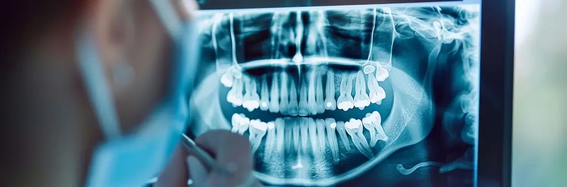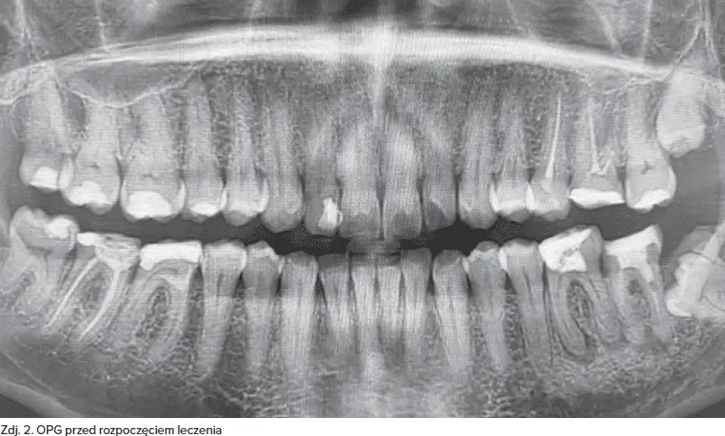 Na podstawie badania klinicznego oraz badań obrazowych stwierdzono znaczne zniszczenie twardych tkanek zębów oraz zmiany w okolicy okołowierzchołkowej zębów 36, 37, zajęcie furkacji zęba 37 oraz obecność zatrzymanego zęba 38.