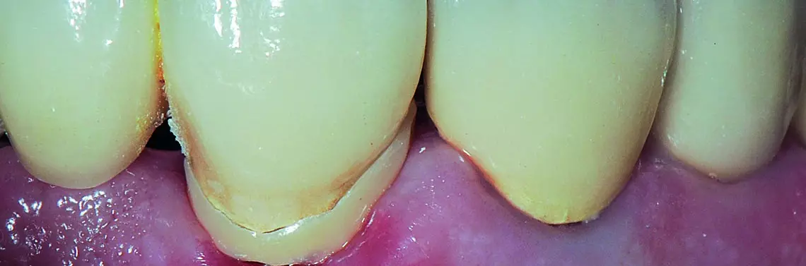 - Oceniono głębokość ubytku próchnicowego pod brzegiem korony jako potencjalnej przyczyny stanu zapalnego miazgi. To pozwoliło wykluczyć jako przyczynę domniemane przeciążenie zwarciowe. Głębokość ubytku zbadano za pomocą zgłębnika periodontologicznego. Ubytek był zupełnie zasłonięty tkanką dziąsłową.