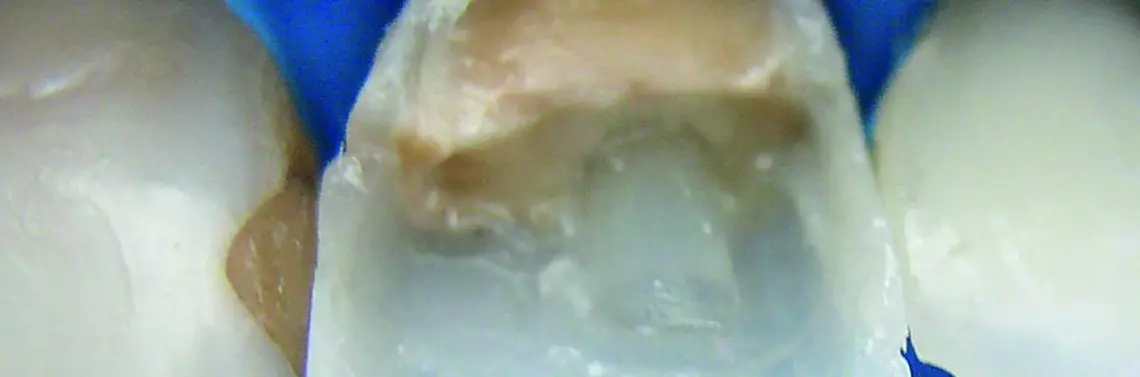 Pacjent po urazowym uszkodzeniu korony zęba 11. Jego życzeniem było wykonanie odbudowy z uwzględnieniem korekty nieestetycznego zabarwienia. Wymusiło to zwiększenie zakresu preparacji dla licówki. Po przygotowaniu przestrzeni dostosowano i osadzono wkład standardowy. Metodą aplikacji warstwowej odbudowano koronę kliniczną zęba 21. (zdj. 10–16).