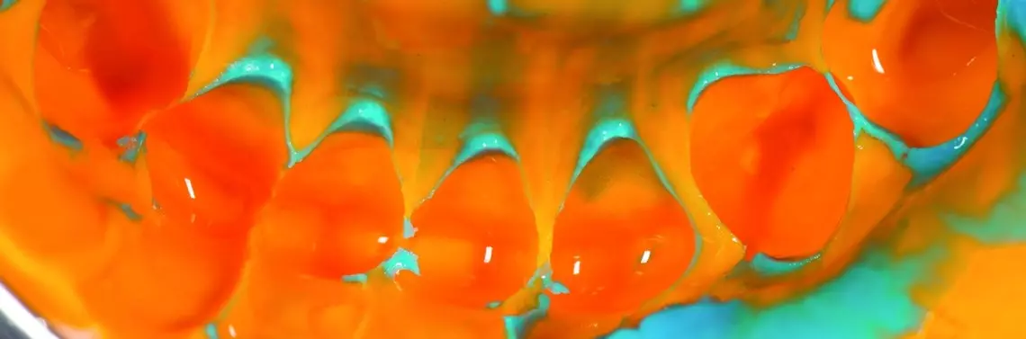 Naprawę tego typu wykonuje się, rozpoczynając od usunięcia z płyty protezy zużytych lub uszkodzonych elementów retencyjnych przy użyciu frezów na prostnicę. Następnie należy wykonać wycisk na protezie masą silikonową w ustach pacjenta w okolicy, w której osadzane będą nowe matryce retencyjne (zdj. 1).