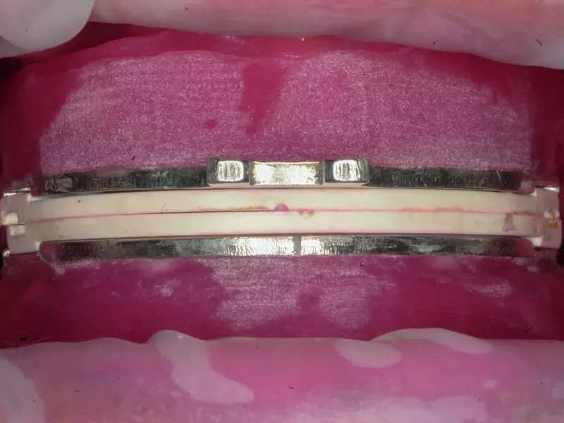 Do przygotowanych otworów w protezie nakłada się ciasto akrylowe i umieszcza w jamie ustnej.