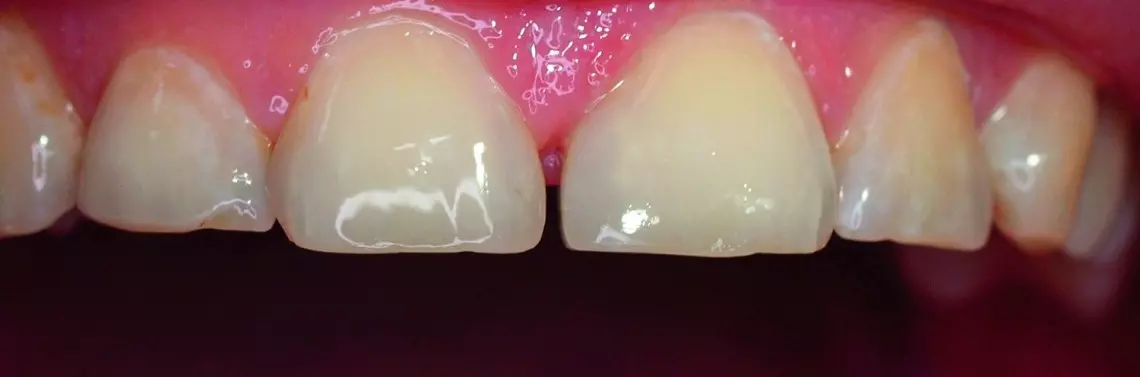 Pacjent zgłosił się z prośbą o dokonanie naprawy uszkodzonych na skutek parafunkcji zębów w odcinku przednim (zdj. 10, 11). Po delikatnym wygładzeniu powierzchni krążkami naniesiono wytrawiacz (zdj. 12). W dalszej kolejności naniesiono i spolimeryzowano system łączący, a następnie materiał szkliwny w kolorze A2, całość wypolerowano (zdj. 13). Po obejrzeniu efektów pacjent poprosił o wykonanie analogicznej korekty dla zębów 31., 41. i 42. (zdj. 14). Efekt ostateczny ukazano na zdj. 15.