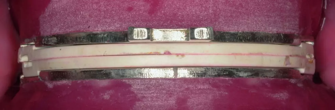 Naprawę tego typu wykonuje się, rozpoczynając od usunięcia z płyty protezy zużytych lub uszkodzonych elementów retencyjnych przy użyciu frezów na prostnicę. Następnie należy wykonać wycisk na protezie masą silikonową w ustach pacjenta w okolicy, w której osadzane będą nowe matryce retencyjne (zdj. 42).