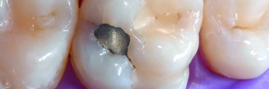 Po założeniu koferdamu usunięto wypełnienia z amalgamatu i materiału kompozytowego z powierzchni zwarciowej zęba 26. Podczas preparacji ubytku stwierdzono znaczący postęp próchnicy w kierunku mezjalnym. Podczas badania ubytku podjęliśmy decyzję o preparacji tunelowej w kierunku powierzchni mezjalnej. Ostrożnie usunięto tkanki próchnicowe przy użyciu niskich obrotów i wiertła do wykańczania o wierzchołku z węglików. Po oczyszczeniu ubytku 2% płynem do płukania z chlorheksydyną założono metalową formówkę, którą na powierzchni mezjalnej dociśnięto klinem w celu ułatwienia odbudowy.