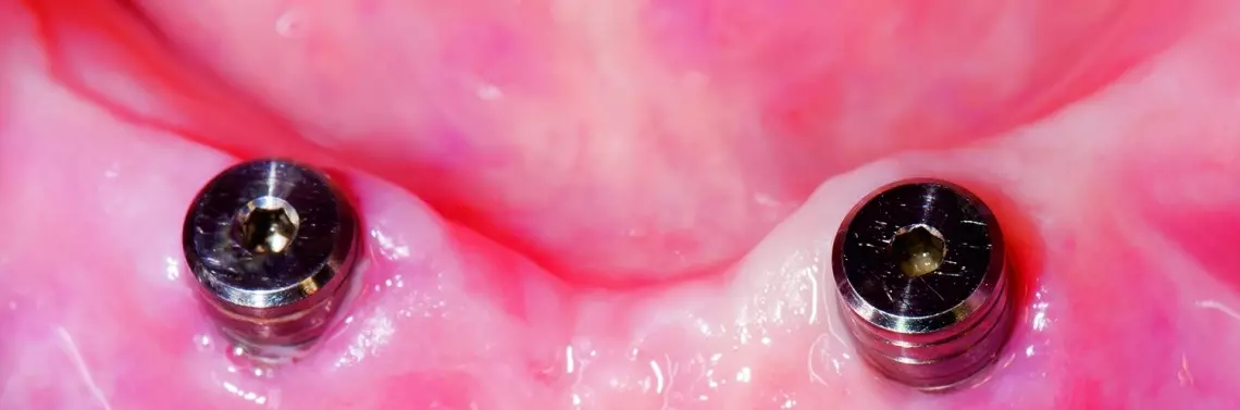 Implanty odsłonięto 27 października 2015 r. Jednocześnie na podniebieniu twardym wykonano przesunięcie dopoliczkowe płata rozszczepionego dowierzchołkowo. Przez 6 tygodni pacjentka nosiła śruby gojące, do czasu uzyskania zadowalającego stanu gojenia tkanek miękkich. W grudniu 2015 r. pobrano wyciski masą polieterową na łyżce indywidualnej, otwartej, łącząc wcześniej śruby wyciskowe masą Patter Resin LS. Protetyczna nadbudowa to zblokowane korony porcelanowe na metalu, wykonane w wersji przykręcanej z dowieszonym zębem 26.