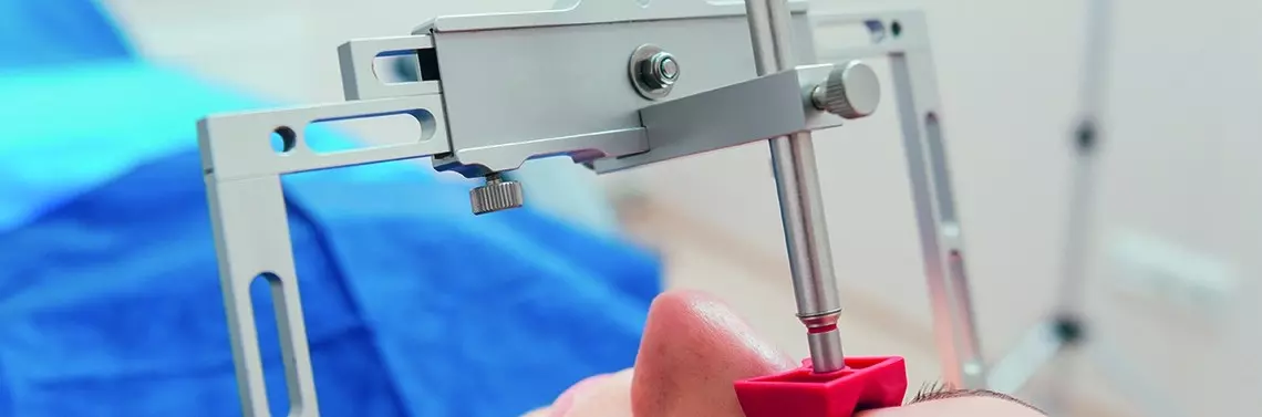 Podpórkę nosową opiera się i tak reguluje jej pozycję, aby wskaźnik płaszczyzny na łuku twarzowym pokazywał okolicę podnosową w rejonie dolnego brzegu otworu gruszkowatego (zdj. 9).
