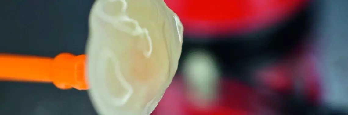 Procedurę cementowania rozpoczęto od zdjęcia uzupełnienia tymczasowego i dokonania próby pracy protetycznej. Oceniono dokładność przylegania, kolor oraz kontakt styczny z koroną zęba 36. za pomocą nici dentystycznej. Pracę pośrednią wykonaną z ceramiki skaleniowej umieszczono na transferze. Oczyszczono powierzchnię wewnętrzną overlaya po wykonanej próbie w jamie ustnej pacjenta z zastosowaniem kwasu ortofosforowego (zdj. 5).