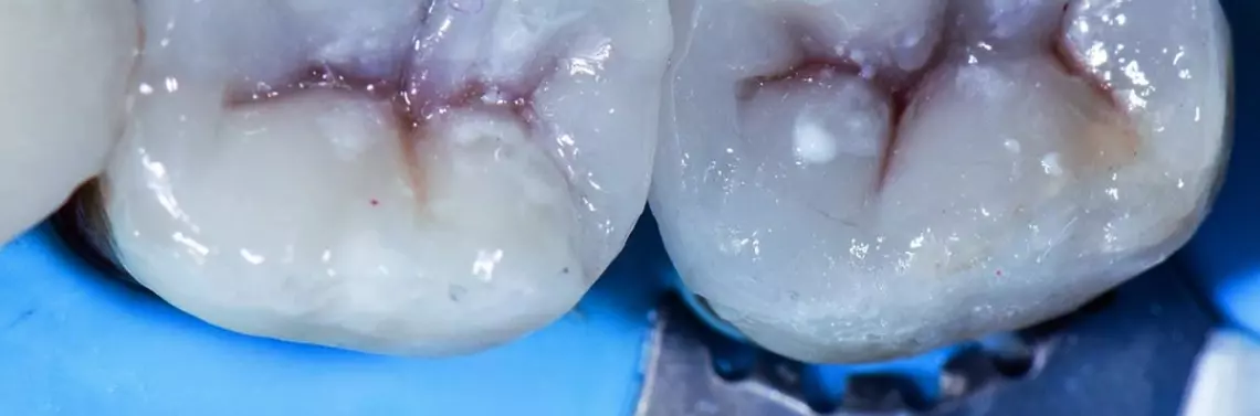 U pacjentki zastosowano znieczulenie miejscowe, podając 1 nabój 4-procentwej artykainy z zawartością 1:100 000 adrenaliny. Przed usunięciem istniejących wypełnień zaizolowano zęby koferdamem. Dla zapewnienia podstawy w postaci twardej zębiny wolnej od próchnicy zastosowano trzykrotnie weryfikację z użyciem preparatu do wykrywania próchnicy (Caries Marker, VOCO). Zmierzono grubość zachowanych guzków. Wynosiła ona u podstawy 3 mm. Brzegi silnie zukośniono, aby zmaksymalizować ilość materiału odtwórczego przy minimalnej redukcji w okolicy guzków i w ten sposób uzyskać dużą powierzchnię kontaktu. Zaplanowano brak kontaktów w zwarciu centralnym i innych nadmiernych kontaktów funkcjonalnych w obszarach ubytków objętych leczeniem.