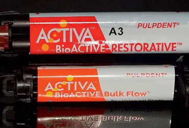 Bulk Flow to najnowsze rozwinięcie i dopełnienie produktów z rodziny Activa firmy Pulpdent (zdj. 1). Szczególną cechą tych materiałów jest potwierdzona w licznych opracowaniach bioaktywność – wpływają na miano S. mutans, modyfikują pH śliny i co wydaje się najistotniejsze, mają zdolność buforowania jonów fluoru, wapnia i fosforanów, co zapobiega powstawaniu ubytków próchnicy wtórnej. Wymiana jonowa materiału z otoczeniem jest możliwa dzięki hydrofilowej matrycy polimerowej (ION-X). Potwierdzone wspieranie remineralizacji i wywoływanie regeneracji kryształów hydroksyapatytu stanowią o wysokiej klinicznej przydatności materiałów z tej grupy.