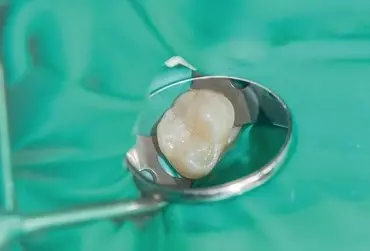 Pacjentka zgłosiła sie z problemem złamanego zęba nr 13, na którym była założona korona porcelanowa. Korona była zacementowana na wkładzie metalowym, zatem w wyniku nagryzienia czegoś twardego doszło do pęknięcia metalowego wkładu wraz z koroną. Ząb nr 13 był w przeszłości leczony endodontycznie. Pilny wyjazd na operację córki za granicę już za dwa dni ograniczył nam możliwości skorzystania z usług laboratorium dentystycznego i musieliśmy znaleźć rozwiązanie tu i teraz. Do głowy przyszło mi wykorzystanie wkładu z włókna szklanego cementowanego na twardy materiał Spee-Dee (Pulpdent) z jednoczesnym cementowaniem korony protetycznej.